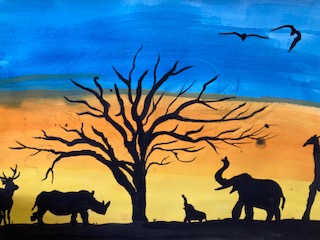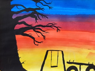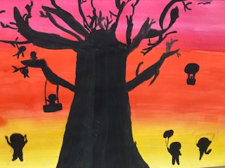色の明暗や色調を徐々に変化させて描いたグラデーションの上に黒色で樹を描きました。情緒あふれる趣きを感じる作品に仕上がりました。