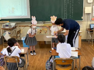 1年生の子どもたちが国語の授業で[かいがら]という物語を読んでいました。くまの子とうさぎの子が出てきます。くまの子がうさぎの子に貝がらをプレゼントしようとするお話です。子どもたちは順番にあたまにお面をつけて、きっとこんな気持ちだったと思うよ、私だったらこう思う、とそれぞれの気持ちになって考えていました。