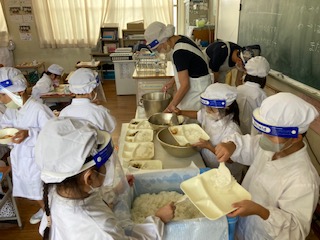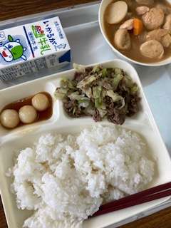 今日の給食のメニューは、一口がんもと里芋のみそ煮、牛肉と野菜の炒め物、みたらしだんご、牛乳、ごはん、でした。今日は、月見の行事献立です。旧暦の8月15日(今年は9月10日)は、[十五夜]や[中秋の名月]といって、月が美しく見える時です。いもやだんごをそなえたり、すすきをかざったりしてお月見をします。今日の給食には里芋とみたらしだんごが出ました。