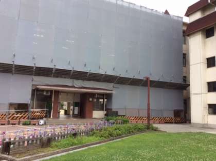 土曜日には足場が組まれていましたが、7月6日(月)には外側に安全幕が張られていて、登校してきた子どもたちも驚いていました。エアコンがつくまで、少し暗くなりますが、あと少しの辛抱です。工事は子どもの学習していない時間に行われていますが、子どもたちにも危険な場所には近づかないように話しています。