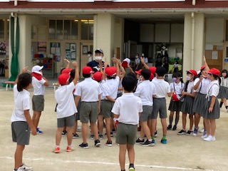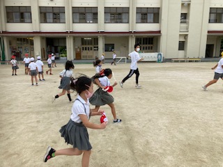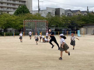 休み時間に3年生の子どもたちがキャーキャー言いながら走り回っています。2人の先生が全力で追いかけます。そう、おにごっこです。子どもたちは先生に追いかけられるのが大好きです。短い休み時間に子どもたちも先生も勉強のストレス発散?子どもたちも元気元気、先生も元気元気、若いっていいなあ。
