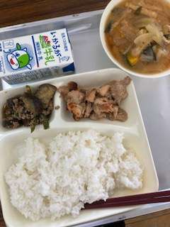 今日の給食のメニューは、鶏肉の照り焼き、みそ汁、なすのそぽろ炒め、牛乳、ごはん、でした。鶏肉の照り焼きは甘辛くて香ばしく、ごはんとの相性もぴったりです。みそ汁は昆布とけずりぶしでだしがとられていて、かぼちゃの甘みがとけ出しておいしかったです。なすのそぼろ炒めは豚ひき肉、なす、ピーマンを生姜と一緒に香りよく炒めて、砂糖としょうゆで味つけしています。