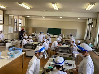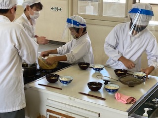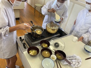 5年生の子どもたちが調理実習をしています。ごはんとみそ汁を作っています。ごはんはガスで炊くので火加減が大切です。強火、中火、弱火、時間係は重要な任務です。みそ汁は煮干しからだしをとりました。グループごとに入れる具材が違います。だから出来上がりも違うので楽しみです。さつまいも、じゃがいも、にんじん、とうふ、ねぎ、わかめ、油あげ…中には、うどんやおもちのグループも。自分たちで相談して決めました。みんなで協力して楽しく活動することができていましたよ。お家で腕をふるう機会があればいいねと話していました。