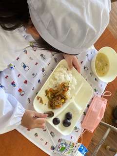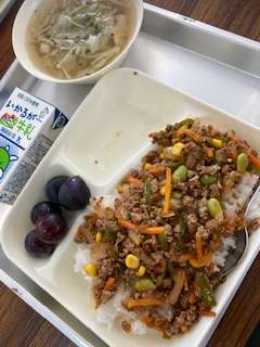 今日の給食のメニューは、野菜たっぷりカラフルライス、キャベツときのこのスープ、ぶどう(巨峰)、牛乳、でした。野菜たっぷりカラフルライスはR3学校給食献立コンクール優秀賞に選ばれた献立です。児童が考えたねらいは、[色をカラフルにし、食欲が出るようにした。運動や勉強を元気に頑張れるようになればいい。]です。ドライカレーのような感じで、おいしかったです。