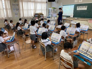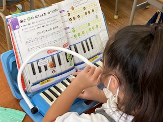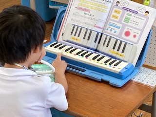 1年生の子どもたちがリズムに合わせて、けんばんハーモニカを吹いています。人差し指で鳴らします。2本指で鳴らします。いろいろな音を鳴らしていました。