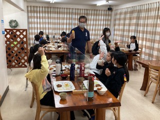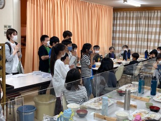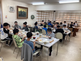 晩ごはんの準備ができたので、みんなでいただきます。みんなお腹ぺこぺこみたいです。ハンバーグやから揚げがあるので、ごはんもおかわりします。夜にはキャンプファイヤーがあるので、しっかりと食べておきましょう。