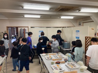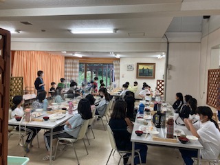 朝ごはん、いただきます。食事係が協力して準備をしました。みんなしっかりと食べていました。朝からやっぱりお腹が空いていたみたいですね。これから魚つかみと林業体験です。
