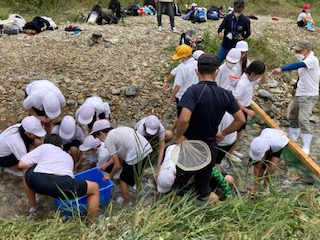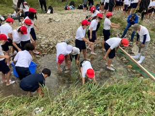 クラスごとに分かれて、あまごつかみと川遊びをしました。川の水量が少し多いので、あまごがなかなかつかめません。必死にみんなで追い込みますが、逃げられてしまいます。みんなの分をつかまえないとみんなが食べることができません。頑張ってつかまえないと。川遊びも大盛り上がりです。カニや小魚探しもできます。知らない間にびしょ濡れの子が続出です。この後、あまごを焼いて食べます。