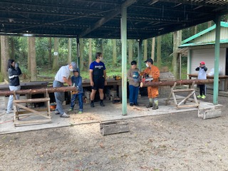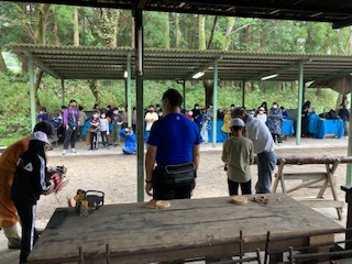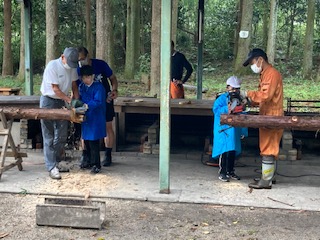 全員がチェーンソー体験をさせてもらいました。先ほど切り倒した木を子どもたちが一人一人自分でチェーンソーを使って輪切りにしていきます。おそるおそるの子どもたちです。もちろん森林組合の方が手を添えて指導しながら一緒にしてくれます。輪切りにした木はおみやげにもって帰ります。