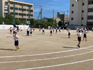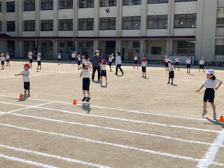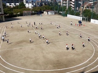 1年生の子どもたちが元気よく運動場で踊っています。音楽に合わせて手を振ったりステップしたり。今日は体系移動も覚えていきます。まっすぐに並んだり円になったり、くるっと回ったり。踊る向きはどっちだったかな。今日は日差しがあるので水分補給もしっかりしながら、頑張っていました。