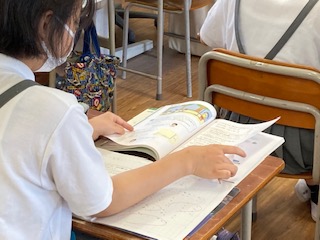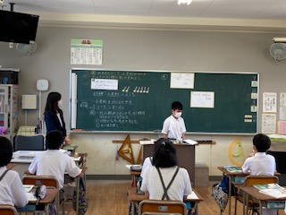 比や比の値を使って問題を解いていきます。問題から予想や見通しを立てて、どのようにして考えていくか、みんなで話し合っていました。前に出て順番に発表していき、みんなでいくつかの考え方があることを確認し合いました。6年生の子どもたちの真面目に学習に取り組んでいる横顔が印象的でした。
