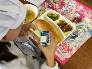 今日の給食のメニューは、牛肉のデミグラスソース煮、スープ、きゅうりのピクルス、牛乳、パン、でした。牛肉のデミグラスソース煮はにんにくを香りよく炒め、ワインで下味をつけた牛肉、たまねぎを炒めて煮込み、デミグラスソースなどで味つけしてまろやかに仕上げていました。スープはチキンスープがベースで、じゃがいも、キャベツ、にんじん、ウインナーが入っていました。きゅうりのピクルスはほんのり酸味が効いていてさっぱりとした口あたりでした。