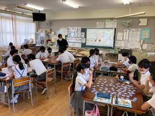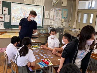 6年生の子どもたちが、よくトランプで遊ぶ神経衰弱をしていました。使うカードはトランプではなく英単語カードです。選んだカードは英語で発音しなければ取れないルールです。めくるたびに発音する必要があるので、それぞれのグループからいろいろな英単語が聞こえてきます。最初のジャンケンも英語でします。遊びながらだと恥ずかしさがなくなるのでメリットがあると思いました。
