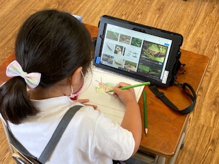 1年生の子どもたちが生活科の学習でタブレットを使っていました。1年生も2学期になって少しずつタブレットを使うようになりました。難しいことはできませんが、慣れることが大事です。先生と一緒に頑張っています。今日はバッタを調べていました。オンブバッタ、トノサマバッタ、ショウリョウバッタ…、子どもたちは画面にバッタが出てくると喜んでいました。そしてそれを見ながらスケッチします。みんな上手です。