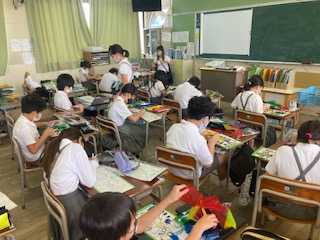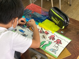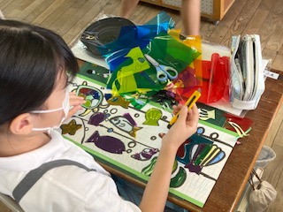 4年生が[ステンドBOX]という図工の教材に取り掛かっていました。下絵を描いてカッターで切り取り、カラーシートを貼り付けていきます。なかなか根気と集中力、ていねいさがいる作業です。子どもたちは一つ一つ作業が進むたびに裏返して出来映えを確認して[うん]とうなづいてから次に進みます。納得のいく作品ができるといいですね。