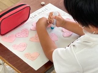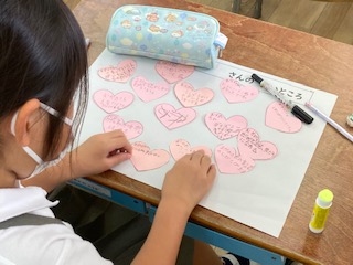 2年生の子どもたちが友だちのいいところを見つけて、ハートのカードに書きました。