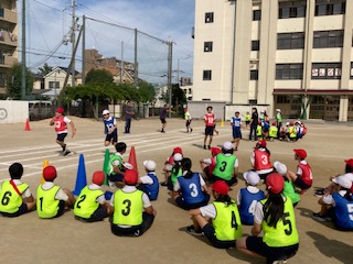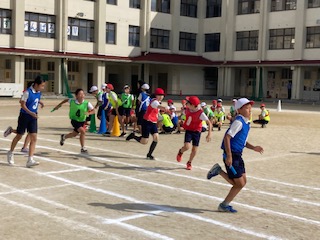 6年生の子どもたち、連日のフラッグ練習は小休止。今日は対抗リレーの練習です。先生から最後まで走り抜くことの大切さを指導してもらいます。誰一人、力を抜きません。一生懸命な顔でバトンをつなぎます。追いつかないとわかっていても全員が全力疾走。そしてアンカーの最後の一人がゴールするまで、みんなで声援を送り続けていました。走り終わったあとの姿勢もよいです。全部通してなかなかできることではありません。改めて感心しました。大道南小学校の6年生、うん、いいですっ!!