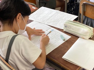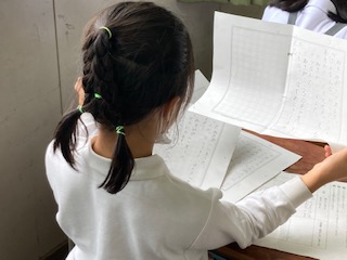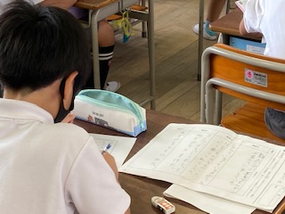 3年生の国語の学習です。何枚かの絵を見て、そのつながりを考えながら、場面ごとに[あらすじメモ]を作ります。そのメモを見ながら、想像を広げて物語を書いていきます。3年生の子どもたちだからこそ、自由で個性的なストーリーが生まれます。子どもたちは少し書いては振り返って読み直し、意欲的に取り組んでいました。あとでお互いに発表し合うと楽しそうですね。
