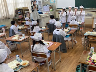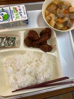 今日の給食のメニューは、みそカツ、じゃがいもと野菜の煮物、焼きのり、牛乳、ごはん、でした。みそカツのみそだれは八丁みそと赤みそを合わせることでまろやかに仕上げています。じゃがいもと野菜の煮物は甘めの和風だしが具材にしっかりとしみこみ、やさしい味でした。焼きのりは味付きのりでした。ごはんをつつんで食べる子とそのままパリパリ食べる子に分かれていました。