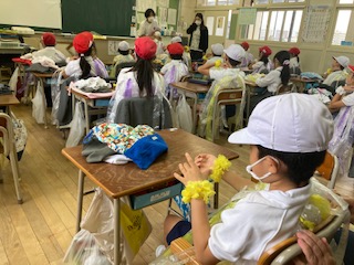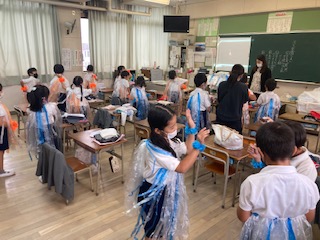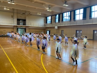 2年生の子どもたちがダンスの衣装を身につけてみました。教室でお互いに見合いっこ。どうかな、どうかな。ひらひらしてていい感じ。かわいいよ。さっそく踊ってみたら、なんかいつもと違う。ウキウキ感が増しました。とても華やかです。ダンスもいつもより上手みたい。思わず笑顔になりました。はやくお家の人に見てもらいたいな。