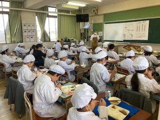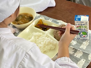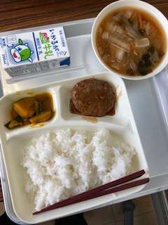 今日の給食のメニューは和風ハンバーグ、みそ汁、かぼちゃのいとこ煮、牛乳、ごはん、でした。和風ハンバーグはやわらかくて、とろみのついたたれがかけられていました。みそ汁は豆腐、たまねぎ、白菜、にんじん、わかめが入っていました。かぼちゃのいとこ煮はかぼちゃの甘みとあずきの甘みが合わさって、さらに甘さに深みが感じられました。