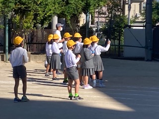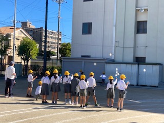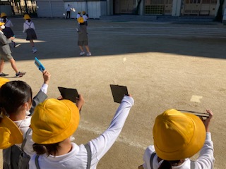 日光はかがみではね返すことができます。はね返した日光はどのように進むのかな。3年生の子どもたちが運動場で、それぞれかがみを持って実験です。はね返した日光はまっすぐに進んで、校舎の壁に明るい光を映し出します。子どもたちはそれがおもしろくて、いろいろなところにかがみを向けます。何人かで同じところに光を集めてみました。光を当てたところをさわってみたら、あったかく感じたよ。どうしてだろう?