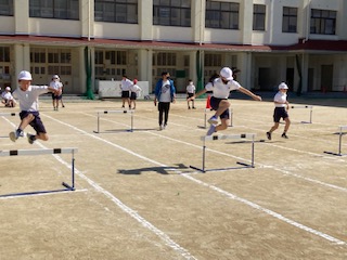 5年生がハードル走の練習をしています。どのリズムで跳ぶのがいいのか、自分に合ったリズムを探していきます。なかなかスピードにのれません。ハードル走にはハードル走の跳び方があるので、それも体で感じないといけません。なかなか奥が深いのです。それでも子どもたちは何度もチャレンジしながら、少しずつ修正していこうとしていたので、さすが5年生ですね。