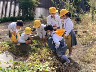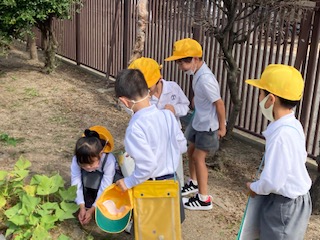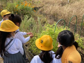 1年生の子どもたちが学習園でなにやら探しています。国語の学習で[はっけんしたよ]という勉強があります。自分が発見したものについて[はっけんメモ]を作って、みんなの前で発表するのです。いつ、どこで、色、形、大きさ、動き、さわった感じ、聞こえる音、思ったことや気づいたことなど…。子どもたちはたんけんボードを首からぶらさげながら、虫や草、花などをたくさん見つけていました。
