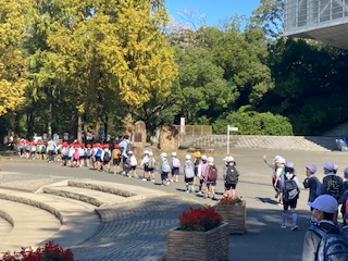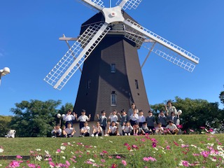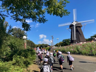 今日は1年生と2年生と一緒に、鶴見緑地公園に遠足に来ています。とてもいい天気で、子どもたちの気持ちもめちゃくちゃ晴れています。さわやかな秋の風がふく中、自然を感じながら、お友だちとおしゃべり。コスモスと風車の前で、クラスごとに記念撮影、ハイチーズ!