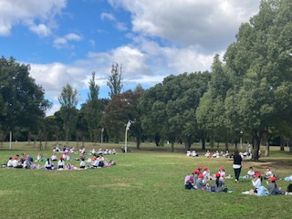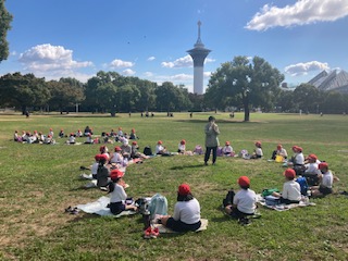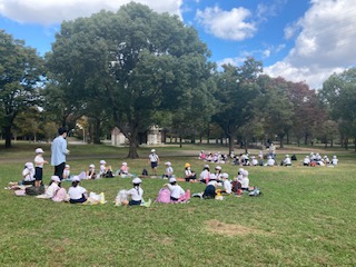 お弁当タイム中です。お家の人に作ってもらったおいしいお弁当、いただきまーす。広い広い芝生の上で、クラスごとに大きな円になって、みんなで一緒に食べています。今日のお弁当はどんなかな。1・2年生は食べるのもゆっくりなので、とってものんびりとしたゆるやかな時間が流れています。お弁当のあとのおやつも楽しいひとときですね。お互いに持ってきたおやつの紹介をしています。