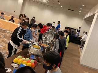 ディナータイムの様子です。会場が豪華で、子どもたちはびっくりしていました。ビュッフェ形式で、自分で食べたいものを取っていきます。メニューがいろいろあるので目移りして悩みます。活動後なのでお腹ぺこぺこです。うれしそうに何回もおかわりに行く子どもたちがたくさんいました。でもみんな本当にマナーがよくて感心しました。