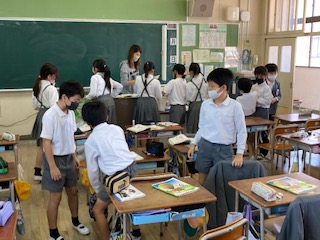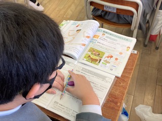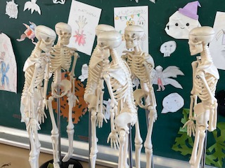 4年生の子どもたちがヒトの体のしくみについて学習していました。どうして体を曲げられるのかな。体を動かすしくみはどうなっているのかな。骨や関節、筋肉が大きく関係しているみたいですよ。子どもたちはわかったことをノートにまとめて先生に提出します。教室の後ろには人骨模型が…、子どもたちは休み時間にこの模型で遊ぶようです。いったいどんな遊びか気になります。