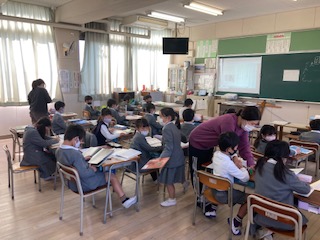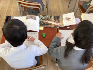 2年生が国語の授業で[ビーバーの大工事]という学習をしました。ビーバーの体のひみつや暮らしについて知ることができました。他の動物も何か秘密があるのかな。先生が図書室から動物に関する本をたくさん持ってきてくれました。子どもたちはいろいろな秘密や特徴を探そうとページを何度もめくります。わかったことや見つけたことをメモして、後で発表するのかな。