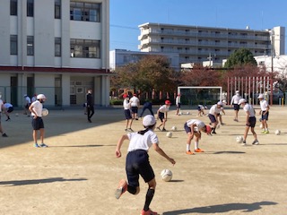 今日は、夢・授業の取り組みとして、セレッソ大阪のコーチ2名に来ていただいて、6年生の子どもたちにサッカースクールを開いていただきました。子どもたちはドリブルやパス、シュートなどのコツを教えてもらいながら、楽しそうにボールと触れ合っていました。コーチにほめられると、とてもうれしそうな顔をしていました。コーチのプレーや技術を見て、子どもたちの中には驚きとあこがれの気持ちを抱いた子もいたことと思います。