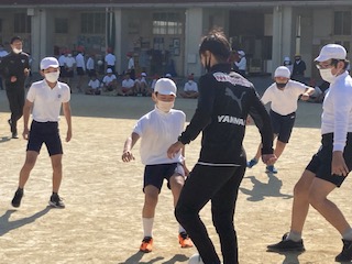 コーチ2人とのゲームでは、接戦が繰り広げられ、点の取り合いのシーソーゲームとなり大盛り上がりとなりました。見学していた先生たちも思わず飛び入り参加して大奮闘しました。もちろんコーチの方々は思いっきり手を抜いていて、子どもたちに楽しいサッカーをさせてくれました。サッカーに限らず夢をもって努力することの素晴らしさや人前で自分をアピールして表現することの大切さなどについても話してもらいました。セレッソのコーチの皆様、楽しいひとときをありがとうございました。