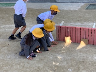 かがみではね返した日光が当たったところは温度が高くなってきたよ。さらにはね返した日光を重ねたらもっと温度が高くなったよ。3年生の子どもたちが運動場で日光を使った実験をしていました。温度計をのぞき込む子たちが温度の変化を大きな声で伝えてくれています。そう言えば、なんだか体もポカポカします。日陰はちょっと寒いかも。日光があるとあたたかいんだね。