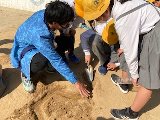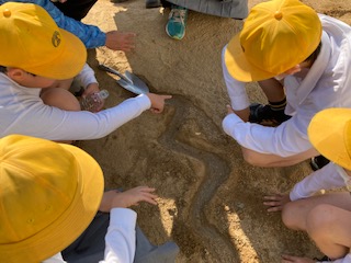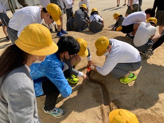 流れる水にはどんなはたらきがあるのだろうか。5年生の子どもたちが土山に集まって実験中です。曲がっているところは、外側は水の流れが速く地面が削られていきます。内側は水の流れが遅くなり土が積もっていきます。みんなでその様子を観察することができました。先生が指をさしながら、詳しく子どもたちに説明しています。そっかぁー、なるほどね。