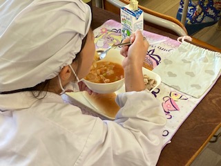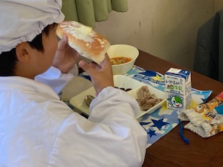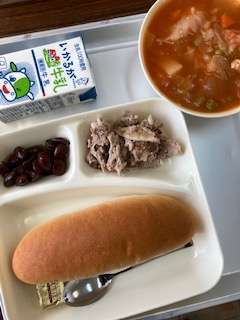 今日の給食のメニューは、豚肉のガーリック焼き、ケチャップ煮、うずら豆のグラッセ、牛乳、パン、でした。豚肉のガーリック焼きはガーリックパウダーやオリーブ油などで下味をつけた後、香味よく焼いています。ケチャップ煮は酸味が効いていて具材も多く、元気が出る感じでした。うずら豆のグラッセは砂糖と塩で味つけし、バターの代わりにオリーブ油でつやを出しています。