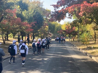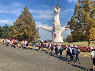 万博記念公園に着きました。今日は4年生が遠足に来ています。秋晴れのとてもよい天気に恵まれて、子どもたちもうれしそうです。太陽の塔に出迎えられました。紅葉を眺めながら歩くのは気持ちがいいです。秋の深まりを感じることができますね。