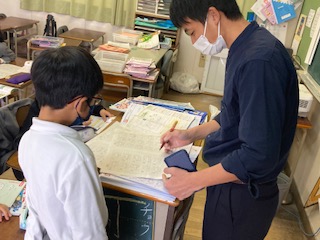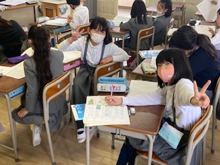 3年生の子どもたちが、計算の仕方について友だち同士、教えてあげたり教えてもらったり…。なるほど、そうするんだね。仲良しさも伝わってきます。見ていて心が和みますね。先生にも進んでたずねにいきます。どうするの?先生も優しくていねいに、こうするんだよって笑顔で応えます。写真を撮ろうとするとピースサインの女の子。授業のじゃましてごめんなさい。とてもいい雰囲気の学習風景でした。