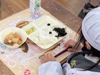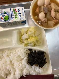 今日の給食のメニューは、関東煮、白菜の甘酢和え、のりの佃煮、牛乳、ごはん、でした。関東煮は甘めの和風だしで具材に味がしみ込むまでしっかりと煮られていておいしかったです。白菜の甘酢和えは甘酸っぱく、さっぱりとしていました。のりの佃煮はしいたけの風味が効いていて、ごはんにとてもよく合いました。