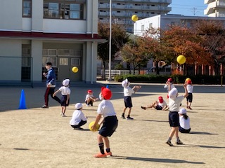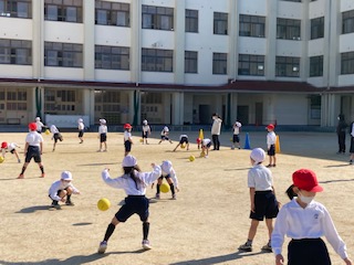 1年生の子どもたちが楽しそうに体育の授業でボール遊びをしていました。日陰は寒いけど、日なたはぽかぽか暖かいです。真上にボールを投げて手をたたきます。何回たたけるかな。ボールを浮かして投げたりバウンドさせたりして上手にキャッチするよ。このあと、ころがしドッジボールもしたんだよ。おもしろかったね。
