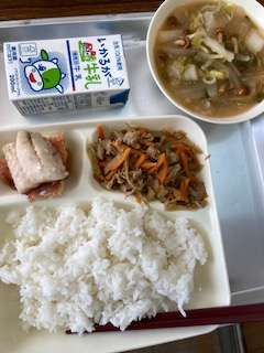 今日の給食のメニューは、赤魚のしょうゆだれかけ、なめこのみそ汁、きんぴらごぼう、牛乳、ごはん、でした。赤魚のしょうゆだれかけは少し甘めの和風だれがかけられていて、赤魚も身がプリっとしていて、ごはんによく合いました。なめこのみそ汁は野菜中心でからだにやさしい感じです。きんぴらごぼうもあまり濃い味つけではなく、ごぼうがおいしかったです。