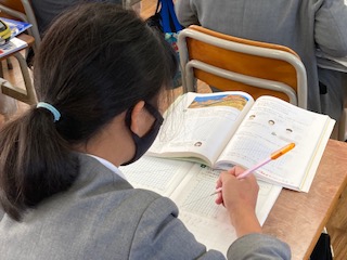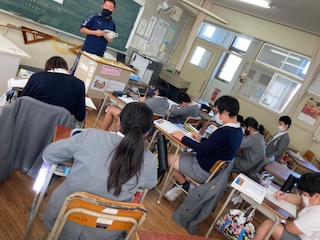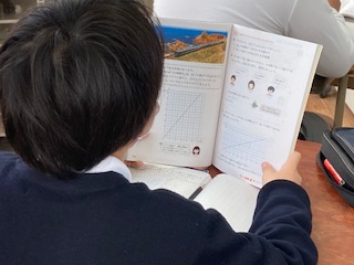 列車の走った時間をx分、走った道のりをykmとして、xとyの関係をグラフに表すと、次のようになりました。このグラフからどんなことがわかるかな。先生の問いかけに、子どもたちは読み取れたことを順番に発表していきます。友だちの意見と同じ場合、異なる自分の考えがある場合など、自分の意思表示をしっかりとすることができる6年生の子どもたちです。