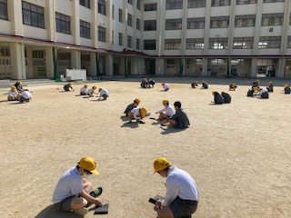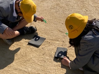 虫めがねを使って黒い紙に日光を集めてみたら…。日光を集めるところを集中して小さくしてみたら…。どうなるのかな。あっ、けむりが出てきたよ。うわっ、穴があいてきた。なんかこげくさいにおいもしてきたで。子どもたちは実験を通して、日光を集中して一か所に集めると、明るく熱くなってくることがわかりました。