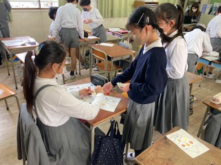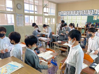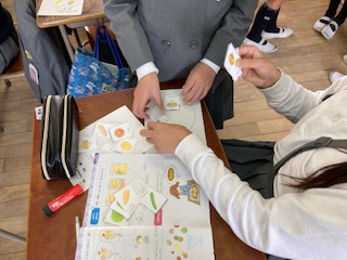 4年生の子どもたちが外国語の授業でオリジナルピザを作っています。What do you want?…それぞれが自分のオリジナルピザにのせるためのトッピングカードをじゃんけんで奪い合います。もちろん具材もじゃんけんも英語です。私のピザにはピーマンと玉ねぎしかのっていないと嘆く子もいれば、豪華スペシャルピザの子もいて、みんなで楽しく活動していました。