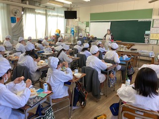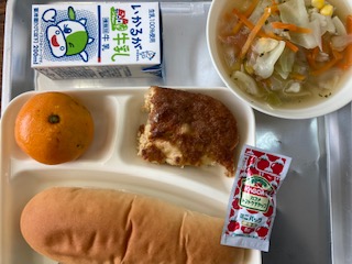 今日の給食のメニューは、ツナポテトオムレツ、鶏肉とキャベツのスープ、みかん、牛乳、パン、でした。ツナポテトオムレツは厚みがあり、じゃがいもが入っているのでボリューム感がありました。鶏肉とキャベツのスープはチキンスープをベースに塩こしょう、しょうゆで味をととのえて、あっさりと飲みやすく仕上げてありました。みかんは一人一つです。