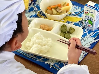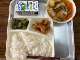 今日の給食のメニューは、あげどりのねぎだれかけ、豚肉とじゃがいもの煮物、きゅうりの赤じそ和え、牛乳、ごはん、でした。あげどりのねぎだれかけは、揚げた鶏肉にねぎの香りがする甘めのしょうゆベースのたれがほどよくからまって、ごはんとの相性もばっちりでした。豚肉とじゃがいもの煮物は、肉じゃがのスープ版のような感じでおいしかったです。きゅうりの赤じそ和えはさっぱりした口あたりで、きゅうりがシャキッとしていました。