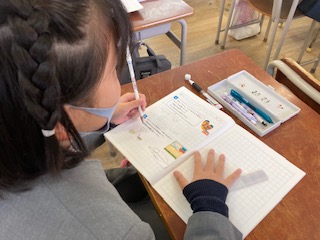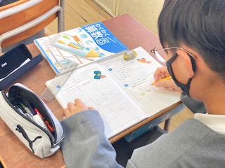 5年生の子どもたちが算数の授業で[単位あたりの量]の学習をしています。このあたりは大変理解するのが難しいところです。○倍、○割、○%・・・。これが文章問題や応用問題になってくると頭がこんがらがってきます。整理するために、問題場面を図に表したり線分図に表したりすることが大切です。先生と一緒に一つずつていねいに押さえながら、問題を解決しようと頑張っていました。聞き漏らさないようにしっかりと先生の話を聞いたり、進んで質問したりする子どもたちの姿が見られました。