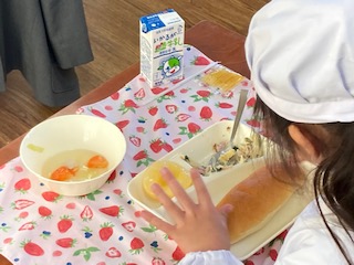 今日の給食のメニューは、ほうれん草のグラタン、スープ煮、白桃(缶)、牛乳、パン、でした。グラタンは子どもたちに人気があります。ほうれん草のほかに、マカロニやベーコン、たまねぎも入っていて、グラタンソースもとてもクリーミーでした。スープ煮は彩りがきれいで、野菜中心のスープです。白桃は缶詰のもので、大きいのでスプーンで切ろうとすると、すべって逃げ回りました。